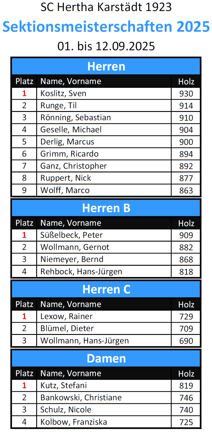 Die Titelverteidigung gelang Peter Süßelbeck im Feld der Herren B mit 909 Holz souverän, ebenso wie Stefani Kutz bei den Damen mit 819 Holz. Erstmalig gelang Rainer Lexow mit 729 Holz auf 100 Wurf der Sieg bei den Herren C.