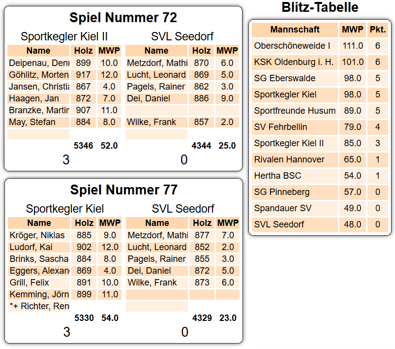 der 1. Bundesliga gegen die beiden Mannschaften der SG Sportkegler Kiel zwei