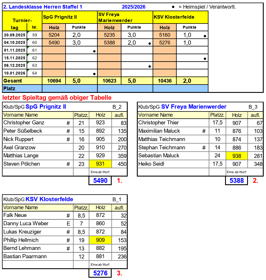 Die Karstädt/Perleberger Spielgemeinschaft teilt sich mit nun jeweils 5 Punkten die Tabellenspitze mit Marienwerder. Am 1. November haben die Rot-Schwarzen auf der Heimbahn im Perleberger Hotel "Stadt Magdeburg" die Chance sich einen ersten Vorsprung zu erarbeiten. Mit jetzt 2 Punkten hat Klosterfelde nur noch Außenseiterchancen darauf in den Kampf um den Staffelsieg einzugreifen, kann aber durchaus noch das Zünglein an der Waage spielen.