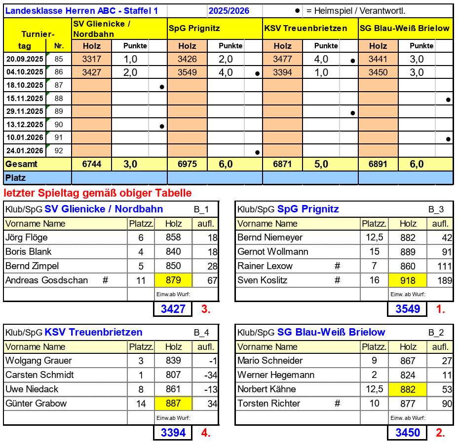 Die Rot-Schwarzen teilen sich mit nun 6 Punkten die Tabellenspitze mit Brielow. Treuenbrietzen folgt mit 5 Punkten auf Rang 3. Glienicke kämpft mit 3 Punkten um den Anschluss und muss beim nächsten Turnier am 18. Oktober auf eigener Anlage liefern.