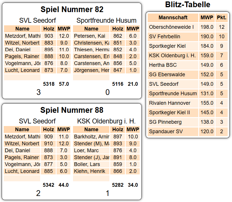 Gegen die SF Husum feierte der SVL einen klaren 3:0-Heimsieg. Die Gegner taten sich auf der Seedorfer Heimbahn schwer und mussten letztendlich mit der Höchststrafe Richtung Fehrbellin abfahren. Am Sonntag sah die Sache anders aus. Die Oldenburger starteten ziemlich stark mit 897 und 893 im ersten Block. Dagegen konnten die Seedorfer Heimspieler noch mit sehr starken 910 Holz von Norbert Witzel und 909 Holz von Mathias Metzdorf mithalten. Der Mittelblock von Seedorf konnte leider nicht dieselbe Leistung wie am vorherigen Tag erbringen, während bei den Oldenburgern wieder der 890er Bereich erklommen wurde. Im Endblock sah es eine Zeit lang so aus, als ob Leo die Ergebnisse der Oldenburger toppen könnte (43 Plus nach 60 Wurf) ist dann jedoch rapide stehen geblieben und kam am Ende nicht über 885 hinaus. Am Ende müssen sich die Seedorfer wegen der starken Oldenburger Leistung mit dem verlorenen Zusatzpunkt abfinden.