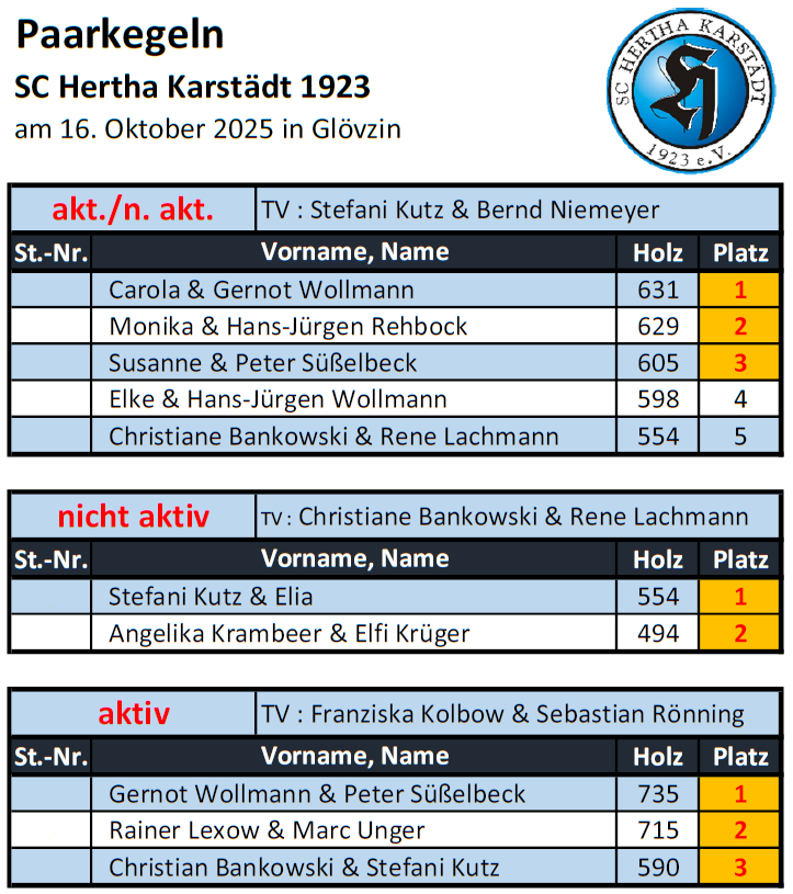 Bei den gemischt-aktiven Paaren setzte sich Wollmann an der Seite seiner Frau Carola mit 631 Holz gegen Monika & Hans-Jürgen Rehbock (629 Holz/Platz 2) auf dem letzten Wurf durch. Bei den Aktiven war die Sache an der Seite von Peter Süßelbeck mit 735 Holz vor Rainer Lexow & Marc Unger (715 Holz/Platz 2) dann deutlich.