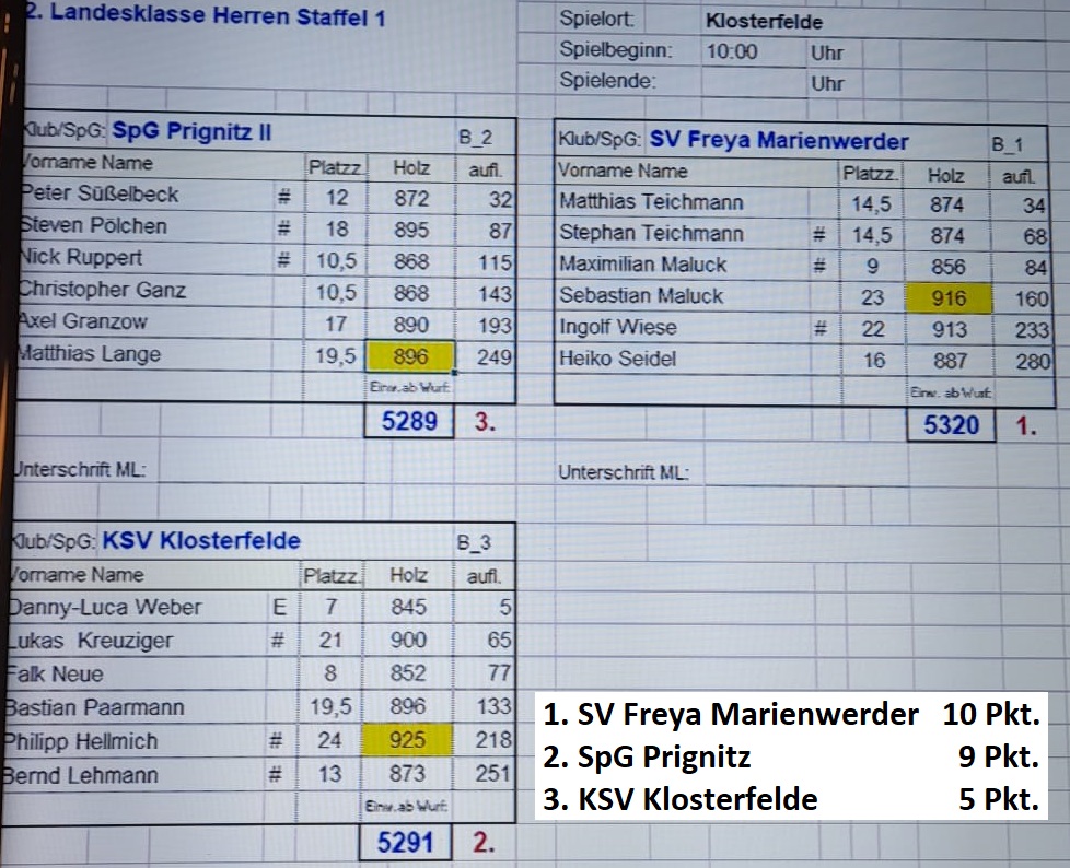 Nach 4 Startern lag die Karstädt/Perleberger Spielgemeinschaftnoch aussichtsreich im Rennen auf Platz 2, wobei nur Steven Pölchen mit 895 Holz überzeugte. Zwar zeigten in den letzten beiden Durchgängen Axel Granzow (890 Holz) und der Mannschaftsbestwert spielende Matthias Lange (896 Holz) gute Leistungen, aber um Marienwerder unter Druck zu setzen reichte das nicht. Stattdessen schob Philipp Hellmich mit dem Tageshöchstholz von 925 Holz Klosterfelde sogar noch an den Prignitzern vorbei.