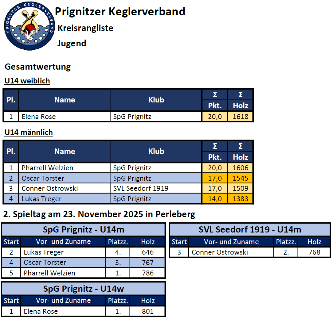 Bevor am Jahresende der finale Spieltag der Kreisrangliste ansteht, ist der Prignitzer Kegelnachwuchs mit Pharrell Welzien im Trikot der Deutschen Nationmannschaft beim Nationencup in Stralsund vom 5. bis 7. Dezember vertreten.