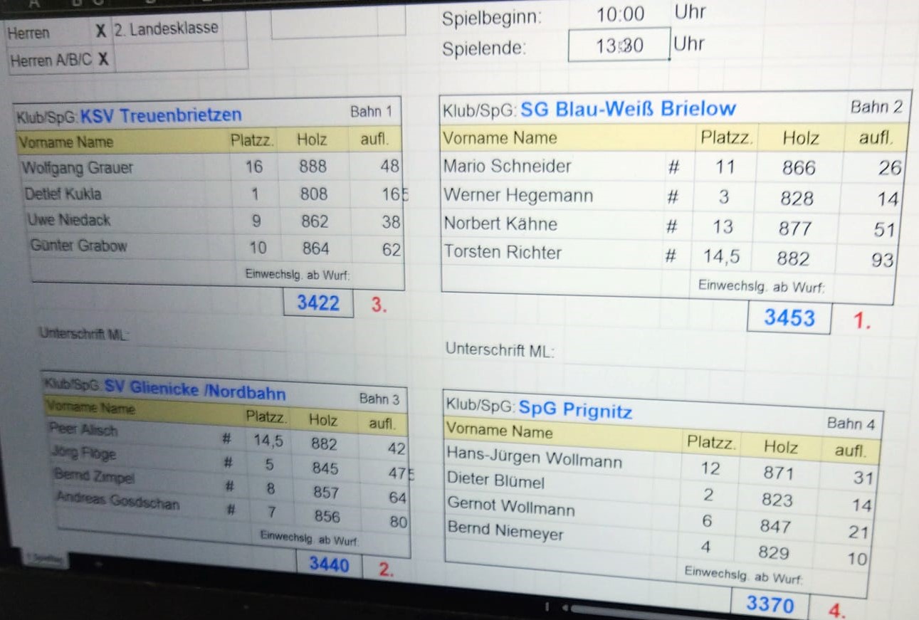 Zeitgleich feierte die SG Blau-Weiß Brielow mit 3453 Holz den ersten Auswärtssieg der Saison und festigte die Tabellenführung mit 17 Punkten noch weiter. Mit 3440 Holz erkämpfte sich der SV Glienicke/Nordbahn den 2. Platz vor dem KSV Treuenbrietzen (3422 Holz/Platz 3). Beide teilen sich mit 12 Punkte den 2. Tabellenplatz.