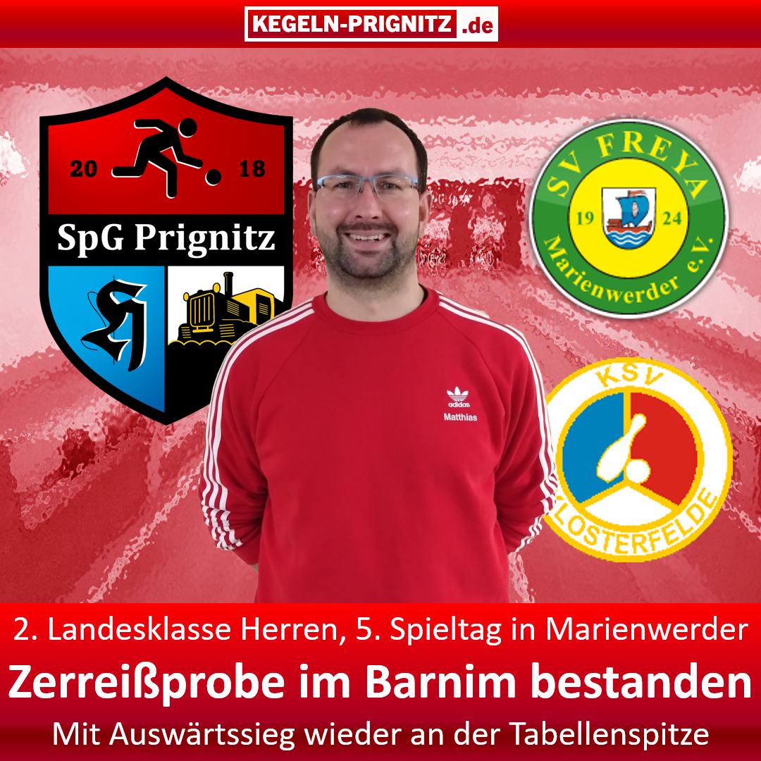 Dem Druck unbedingt erneut bei Hauptkonkurrent Marienwerder gewinnen zu müssen konnten sich nicht alle Rot-Schwarzen erwehren. Nach Nick Ruppert (889 Holz), Peter Süßelbeck (878), dem Mannschaftsbesten Matthias Lange (917), Axel Granzow (907) sowie Christopher Ganz (875) waren die Barnimer auf 32 Holz enteilt und hatten schon eine Hand am vorzeitigen Staffelsieg. Im letzten Durchgang konnte Steven Pölchen mit 902 Holz gegen einen schwächelnden Gegner aber doch noch die entscheidenden Hölzer gutmachen.