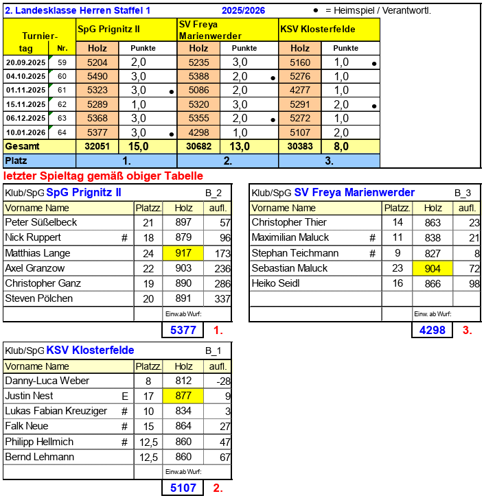 Mit Spannung erwartete die Karstädt/Perleberger Spielgemeinschaft das Duell mit dem punktgleichen SV Freya Marienwerder. Da die Barnimer zum entscheidenden Wettkampf allerdings in Unterzahl an den Start gingen, blieb ein packender Vergleich aus. Obwohl der 4. Saisonsieg zwar fast kampflos an die Prignitzer ging, war dieser nicht unverdient. Im Vergleich zur Hinrunde erzielten die Rot-Schwarzen noch einmal 54 Hölzer mehr.