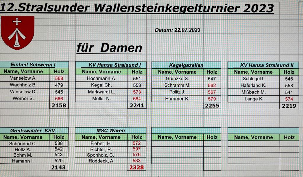 Bei den Damen wurde die Siegesserie der Kegelgazellen aus Berlin gebrochen und die Hauptstädterinnen mussten sich mit dem zweiten Platz (2255 Holz) begnügen. Der Sieg ging mit 2328 Holz deutlich an die Damen des MSC Waren. Den dritten Platz sicherten sich die Damen des Gastgebers KV Hansa Stralsund I mit 2241 Holz vor Hansa Stralsund II (2241 Holz), Einheit Schwerin (2158 Holz) und dem Greifswalder KSV (2143 Holz).