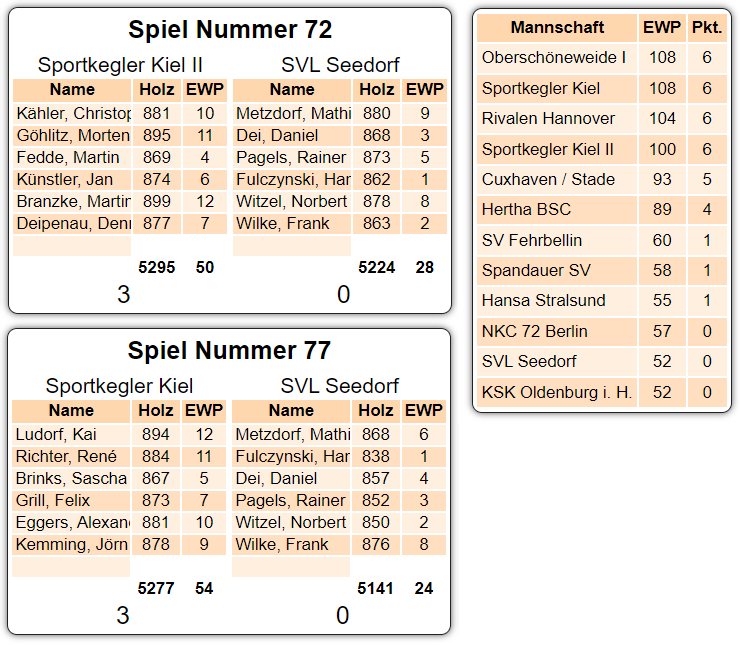 Bei der 5295:5224 (50:28)-Niederlage des SVL gegen Aufsteiger Kiel II konnten mit dem Mannschaftsbestwert schiebenden Matthias Metzdorf (880 Holz) und Norbert Witzel (878) zumindest noch 2 Seedorfer Akzente setzen. Einen Tag später gegen den Medaillenkandidaten Kiel I hingen die Trauben mit 5277:5141 (54:24) noch einmal höher. Frank Wilke sammelte mit 876 Holz noch die meisten Einzelwertungspunkte.