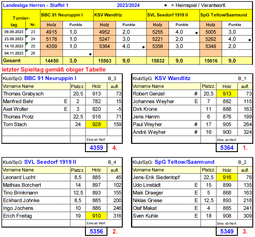 Am 4. November kommt es in Neuruppin zum großen Finale um den Einzug in die Meisterrunde. Da Seedorf II, Wandlitz und Teltow/Saarmund punktgleich mit 9 Zählern ins Rennen gehen, ist Hochspannung garantiert.