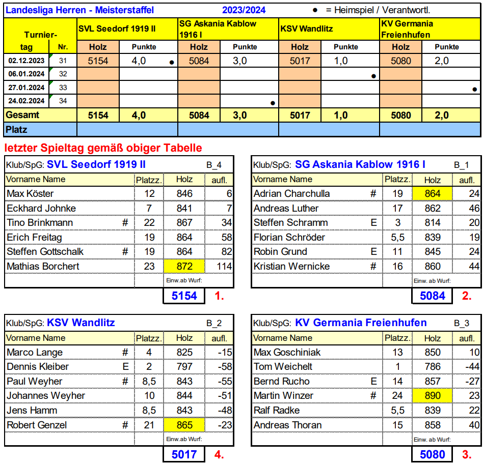 Dabei erwischte die ohne Kapitän Ingo Jochens, Leonard Lucht und Jürgen Reimann angetretene Seedorfer Bundesligareserve einen holprigen Start. Nach Anschieber Max Köster (846 Holz) und Eckhard Johnke (841) lagen die Gastgeber nach zwei Durchgängen noch 39 Holz hinter Kablow auf Rang zwei. Dann aber wendeten Tino Brinkmann (867), Erich Freitag (864) und Steffen Gottschalk (864) das Blatt zugunsten des Heimteams. Schlussspieler Mathias Borchert krönte den Auftritt des Liganeulings mit dem Mannschaftsbestwert von 872 Holz. Das beste Tagesergebnis schob Freienhufens Martin Winzer mit 890 Holz.