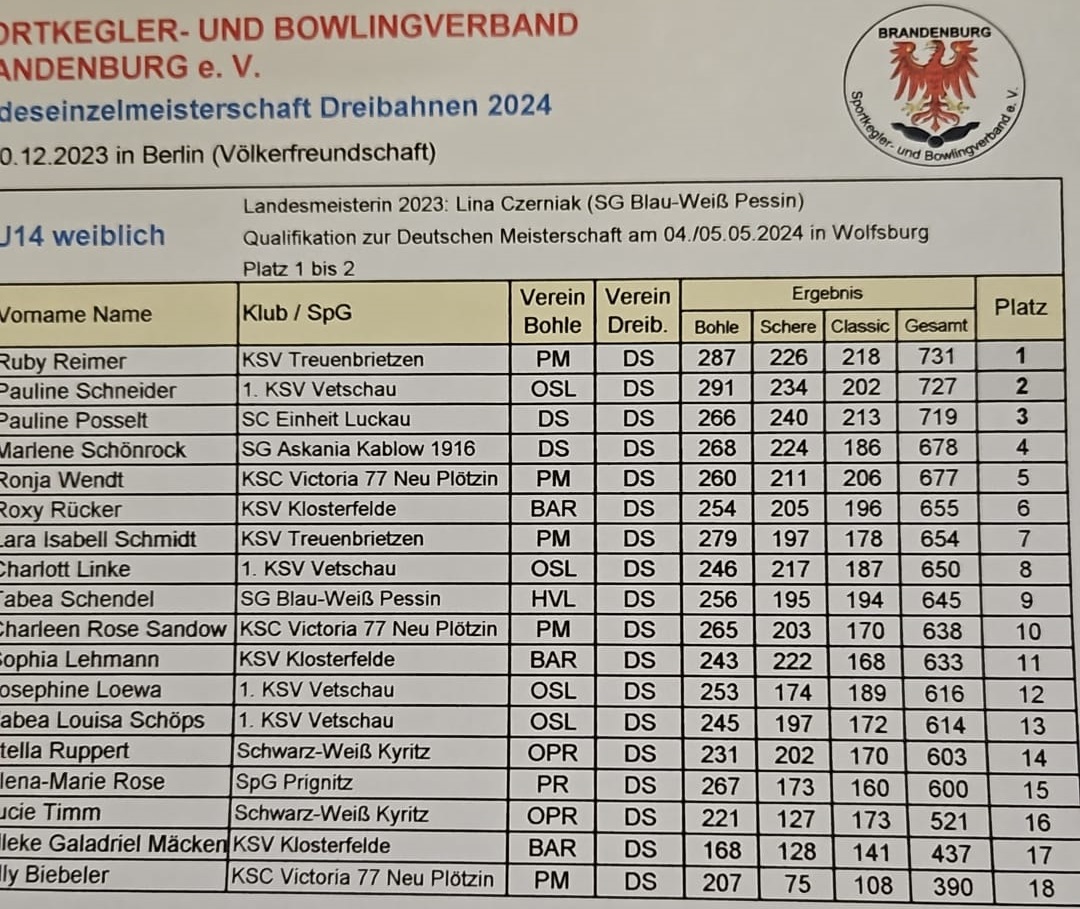 Das einzige Mädchen der SpG Prignitz Elena Rose belegte mit 600 Holz Rang 15. Neue Landesmeisterin wurde Ruby Reimer vom KSV Treuenbrietzen mit 731 Holz.