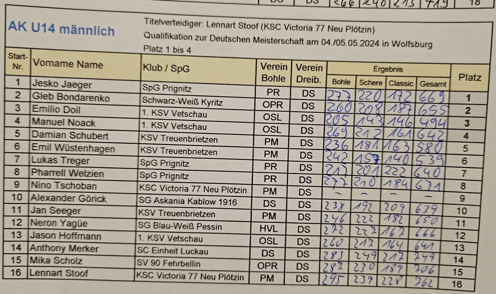 Wolfsburg (Platz 1-4 vom 3. bis 5. Mai 2024) qualifizieren konnte.