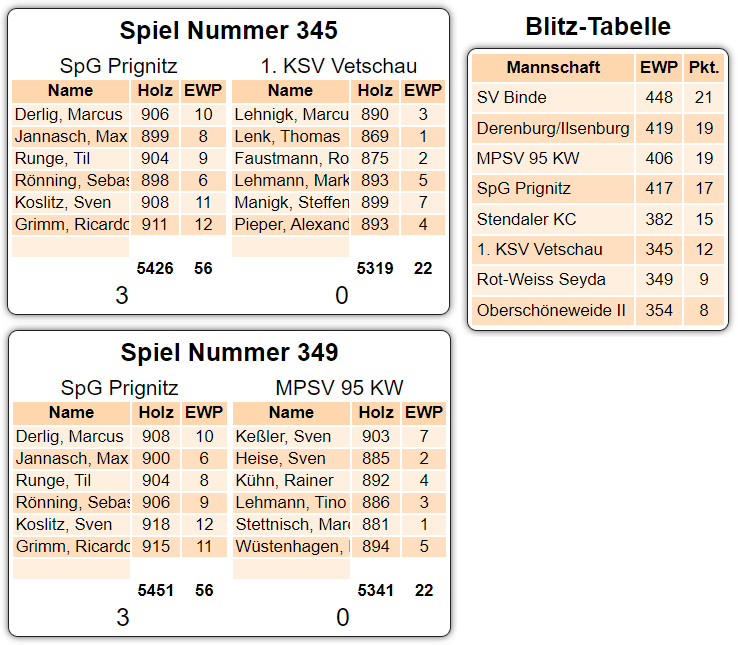 Die Rot-Schwarzen boten an beiden Tagen wenig Angriffsfläche und erreichten gegen KW erstmals geschlossen Ergebnisse jenseits der 900-Holz-Marke. Trotzdem drückte die Prignitzer Schlussachse aus Sven Koslitz (908/918) und Ricardo Grimm (911/915) mit den Tagesbestwerten den Partien ihren Stempel auf. Steffen Manigk (899 Holz/1. KSV Vetschau) und Sven Keßler (903/MPSV 95 KW) verhinderten dabei mit den Mannschaftsbestwerten jeweils die Höchststrafe für ihre Teams.