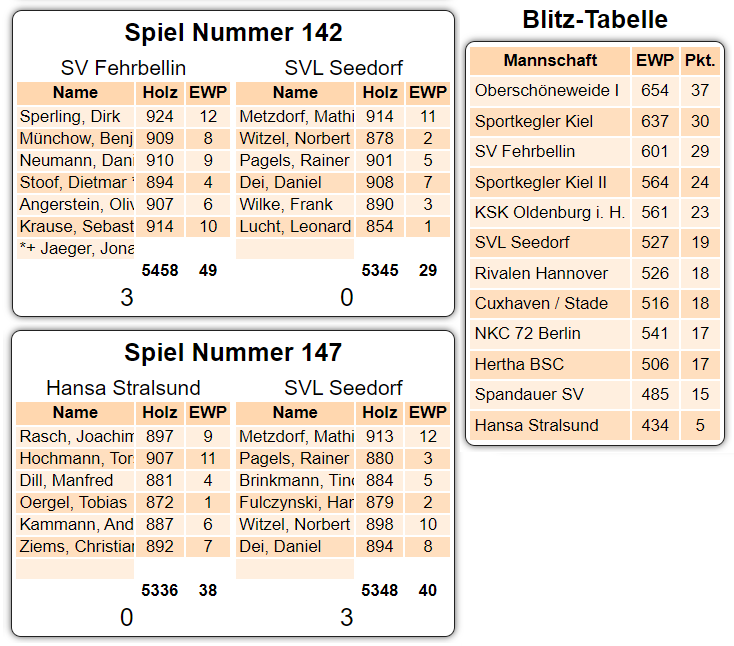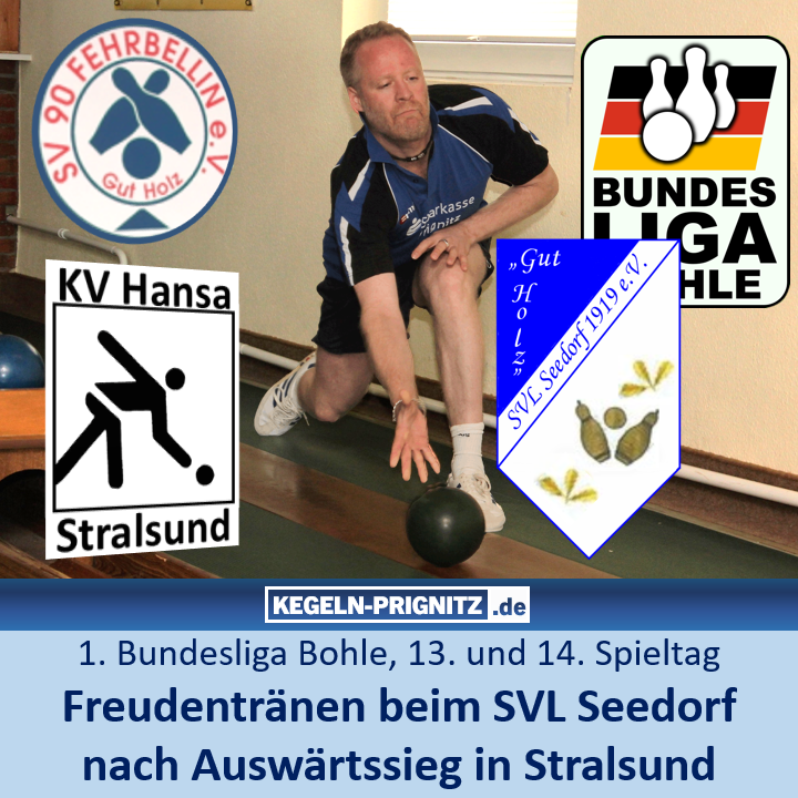 Zuvor hatten sich die Seedorfer im Brandenburg-Derby beim Tabellendritten SV 90 Fehrbellin trotz der 5345:5458 (29:49/0:3)-Niederlage teuer verkauft. „Auch in Fehrbellin haben wir klasse gespielt, haben mit drei Mann über 900 Holz gespielt. Da sind wir unverdient mit 0:3 nach Hause gefahren“, meinte Wilke. Von einem Wendepunkt wollte Frank Wilke nach dem Sieg in Stralsund noch nicht sprechen. „Die Ausgangsposition hat sich verbessert. Wir müssen aber äußerst wachsam bleiben und unsere Hausaufgaben machen. Es kommen noch vier Heimspiele, unter anderem gegen Kiel, die nicht zu unterschätzen sind.“