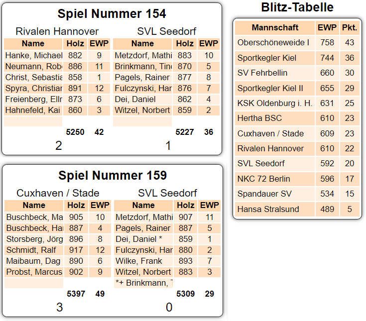 Einen Tag später zogen die Seedorfer gegen die KSG Cuxhaven/Stade mit 5397:5309 Holz, 49:29 EWP und 3:0 Punkten den Kürzeren. In der Tabelle belegen die Prigniter nun den 9. Platz und hoffen sich bei den nächsten Heimspielen gegen die SG Sportkegler Kiel I und II am 3. und 4. Februar weiter von den Abstiegsplätzen zu distanzieren.