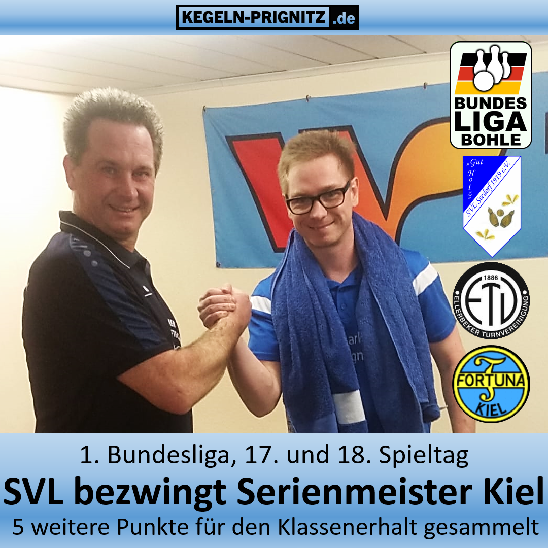 Nach einem souveränen 3:0-Sieg (5338:5254 Holz/49:29 EWP) gegen die zweite Kieler Vertretung setzt sich der SVL einen Tag später auch in einem packenden Duell gegen Kiel I mit 2:1 (5328:5322/39:39) durch.
