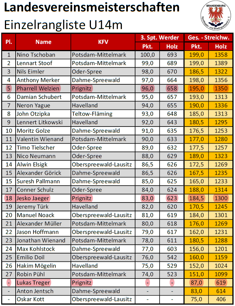 Hinter den beiden Topergebnissen von Nino Tschoban (693 Holz) und Lennart Stoof (689/beide Potsdam-Mittelmark) reihte sich überraschend Nils Eimler vom KKV Oder-Spree mit 670 Holz auf Platz 3 ein. SpG-Primus Pharrell Welzien musste mit 658 Holz auch Marcel Merker (664) vom KFV Dahme-Spreewald den Vortritt lassen und belegte Platz 5. In der Gesamtwertung belegt der junge Karstädter nun Platz 4.
