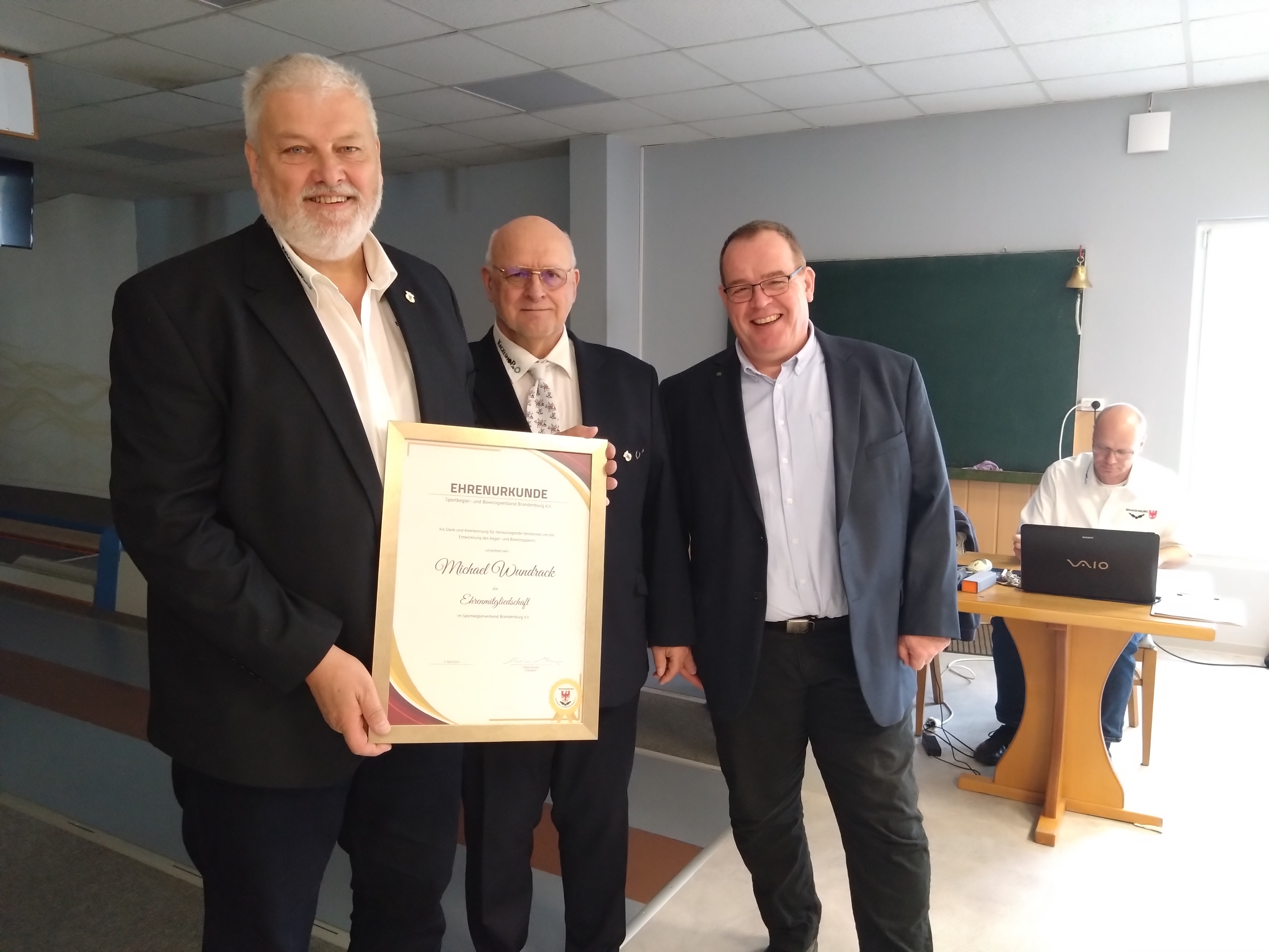 Michael Wundrack vom SV Empor/Grün-Rot Wittenberge wurde nach 19-jähriger Tätigkeit als Landesjugendwart auf dem Verbandsjugendtag „als Dank und Anerkennung für herausragende Verdienste um die Entwicklung des Kegel- und Bowlingsports“ die Ehrenmitgliedschaft im Sportkeglerverband Brandenburg durch SKVB-Präsident Dieter Arnoldt und seinen Nachfolger Enrico Krenz verliehen.