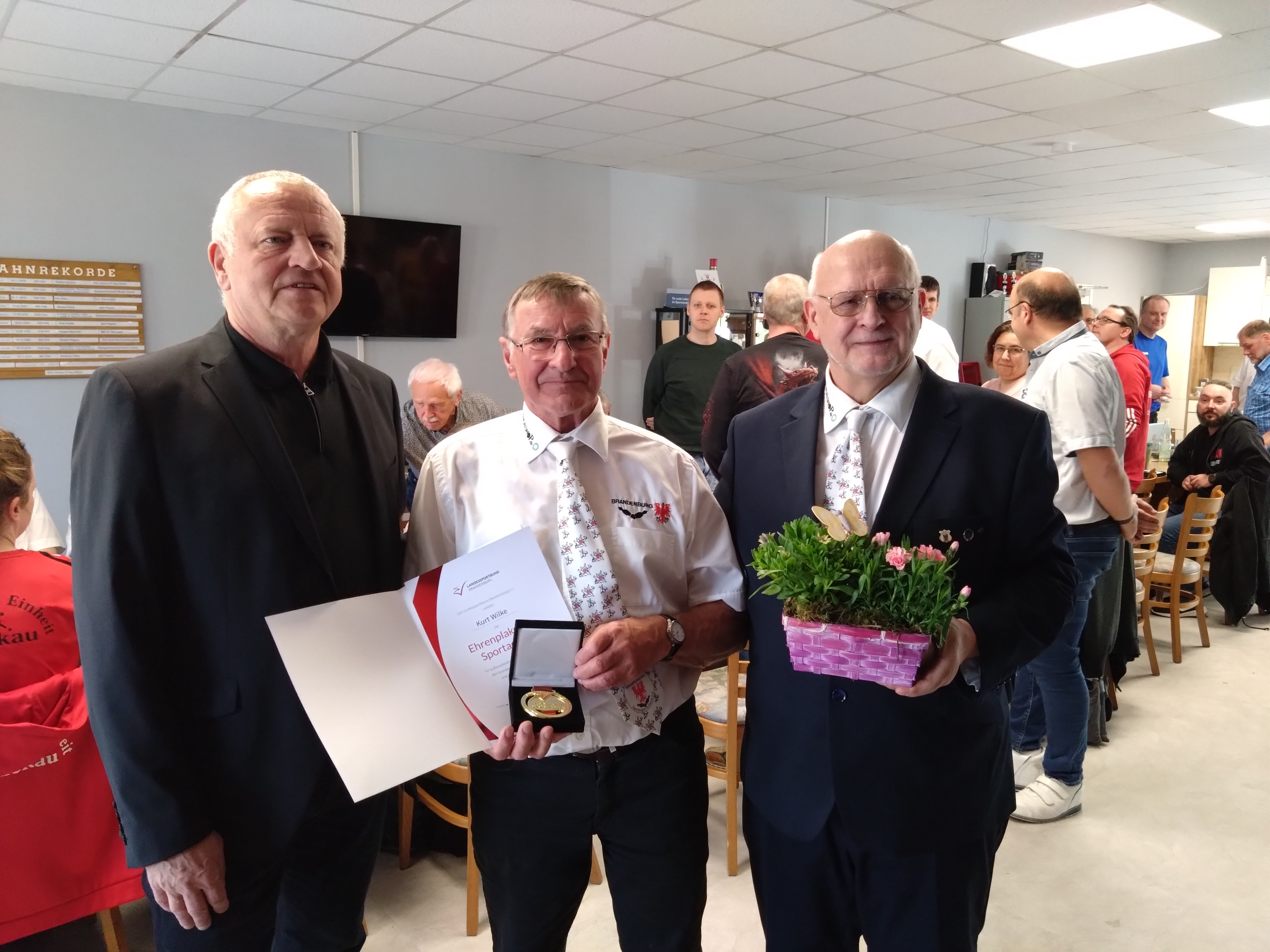 Dieter Arnoldt (m.) die Ehrenplakette Sportadler verliehen