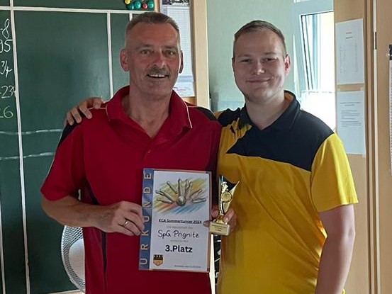 Größter Unterschied zum Turnier vor 2 Wochen war, dass es über alle 6 Bahnen ging. SpG-Anschieber Peter Süßelbeck überzeugte auch direkt mit dem Mannschaftsbestwert von 860 Holz. Hinter dem erneut Tagesbestwert spielenden Binder Carlo Thiede (882 Holz) reihten sich die Rot-Schwarzen auf Rang 2 ein, wodurch sich die Prignitzer früh auf einem guten Weg sahen. An zweiter Stelle geriet der SpG-Motor aber ins stottern. Gerade die Bahnen 5 und 6 bereiteten Michael Geselle große Probleme und er musste sich mit 841 Holz zufrieden geben. Da der KCA mit Torsten Mersetzky (844), Thomas Thiele (850) und Andre Wyrembek (840) aber nicht zum großen Gegenschlag ausholte, schien es verkraftbar, dass die weiteren SpG-Kegler Til Runge (835) und Sven Koslitz (843) ähnliche Schwierigkeiten wie Geselle hatten. KCA-Schlussspieler Yanneck Preilowski erwischte aber im Gegensatz zum letzten Aufeinandertreffen einen ganz starken Tag und schob den Gastgeber mit dem Mannchaftsbestwert und zweitbesten Ergebnis des Tages von 876 Holz noch an der SpG vorbei auf Rang 2.