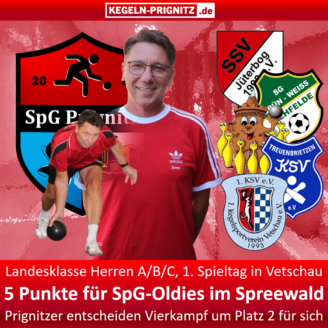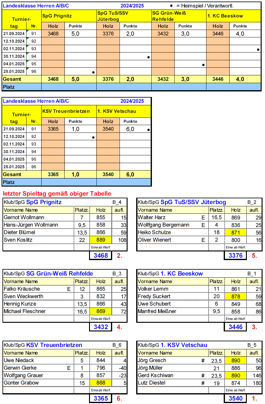 Während Aufsteiger Vetschau bei seinem Heimspiel mit Jörg Gresch und Gerd Kschiwan (jeweils 890 Holz) die beiden Tagesbesten stellte und auch sonst keine Geschenke an die Gäste verteilte, lieferten sich die Rot-Schwarzen einen Vierkampf mit Beeskow, Jüterbog und Rehfelde um Rang 2. Treuenbrietzen konnte von Beginn an nicht mithalten. Nach Gernot Wollmann (855), Hans-Jürgen Wollmann (858) und Dieter Blümel (866) hatte die SpG 9 Holz Rückstand auf Beeskow sowie 3 Holz Vorsprung auf Jüterbog und 16 Holz auf Rehfelde. Zum Joker wurde der Schlussspieler der Karstädt/Perleberger Spielgemeinschaft. Der etatmäßige Topspieler des Zweitligateams Sven Koslitz erzielte mit 889 Holz das beste Ergebnis aller Auswärtigen und brachte damit die 5 Punkte unter Dach und Fach.