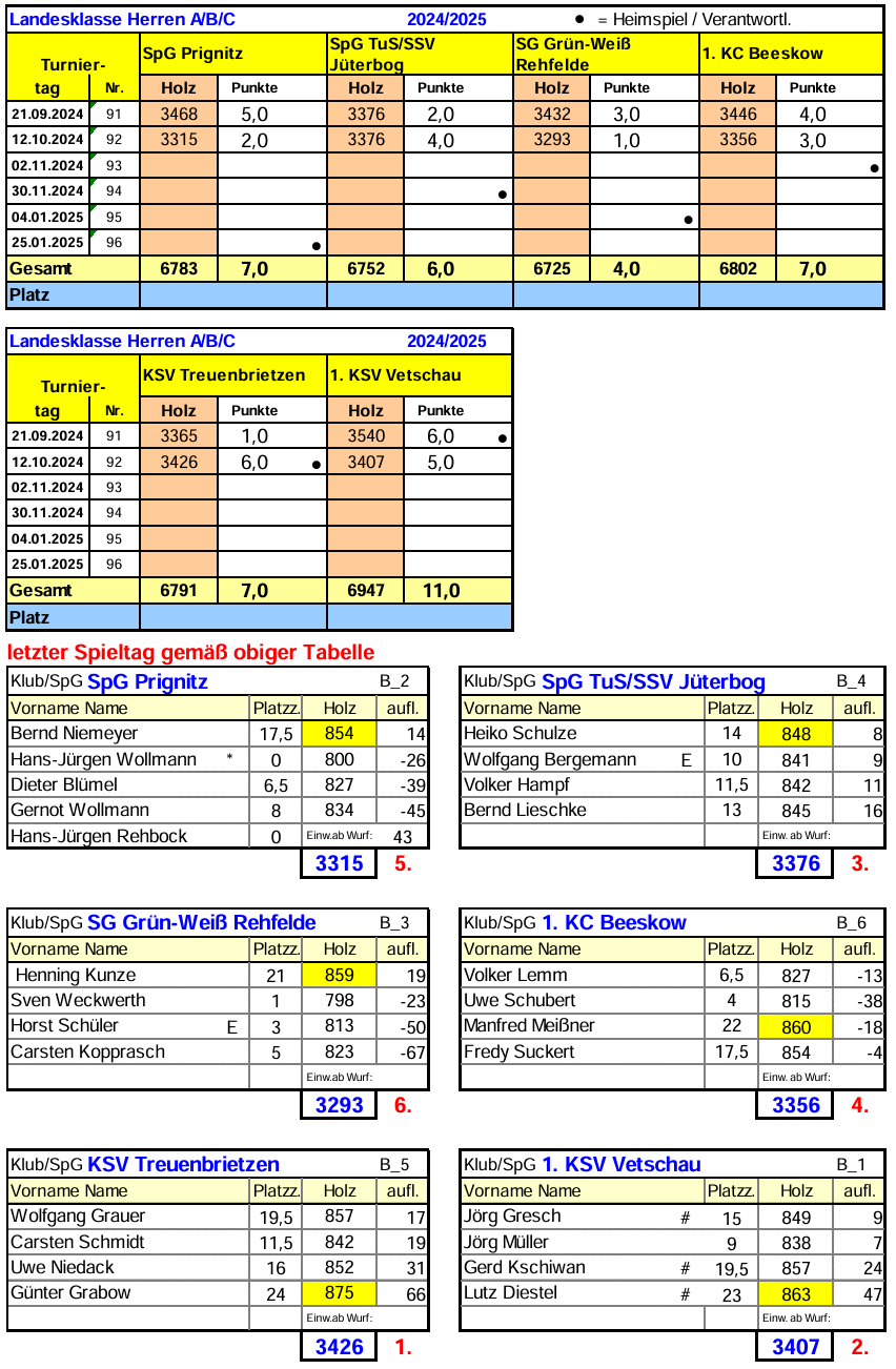 ln der Gesamtwertung baut der 1. KSV Vetschau (11 Punkte) die Tabellenführung aus. Dahinter teilen sich die SpG Prignitz, der 1. KC Beeskow und der KSV Treuenbrietzen Platz 2 mit 7 Punkten. Den letzten Nichtabstiegsplatz belegt die SpG TuS/SSV Jüterbog (6 Punkte).