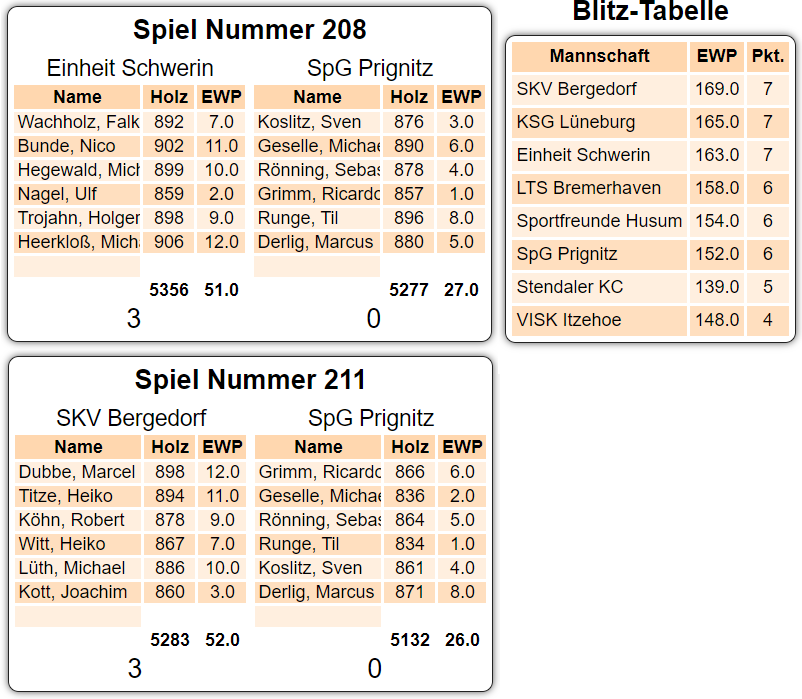 In beiden Duellen konnte die Karstädt/Perleberger Spielgemeinschaft durchaus Akzente setzen, ohne dabei aber den begehrten Zusatzpunkt für die Gastgeber in Gefahr zu bringen. Mit weiterhin 6 Punkten rutschen die Prignitzer auf Tabellenplatz 6 ab. Neuer Tabellenführer ist Sonntagsgegner SKV Bergedorf mit 7 Zählern punktgleich vor der KSG Lüneburg und dem KC Einheit Schwerin. Schlusslicht ist der VISK Itzehoe mit 4 Punkten.