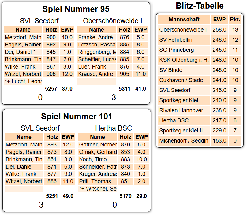 Die prignitzer Vorzeigekegler verteidigten damit den 7. Tabellenplatz und haben mit 9 Punkten einen Zähler Vorsprung auf einen Abstiegsplatz. Nun folgen am 9. und 10. November zwei schwere Auswärtsspiele in Kiel gegen die SG Sportkegler I und II.