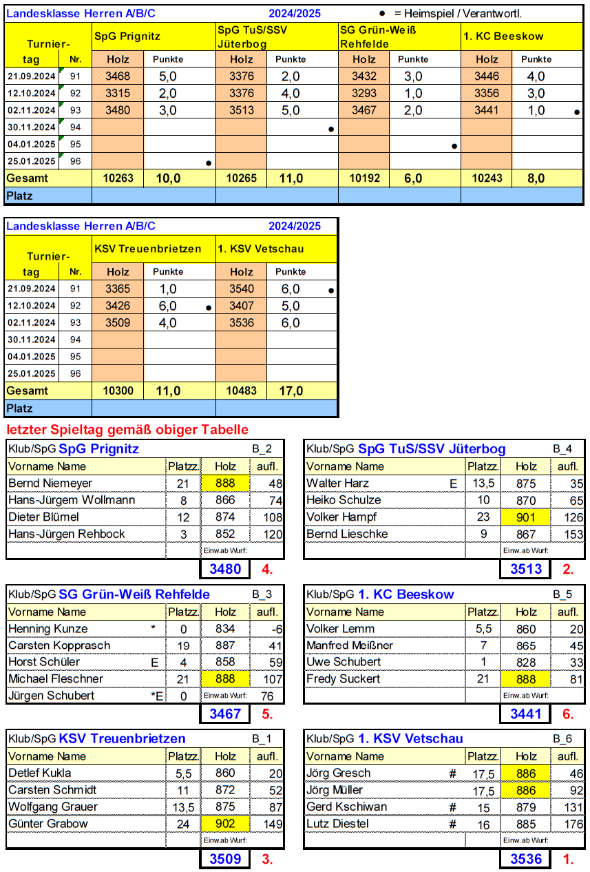 Tabellenführer 1. KSV Vetschau errang mit 3536 Holz den zweiten Turniersieg der Saison und zieht mit 17 Punkten der Konkurrenz weiter davon. Die SpG TuS/SSV Jüterbog (2. Platz/3513 Holz) und der KSV Treuenbrietzen (3./3509) haben als erste Verfolger mit jeweils 11 Punkten schon einen gehörigen Rückstand.