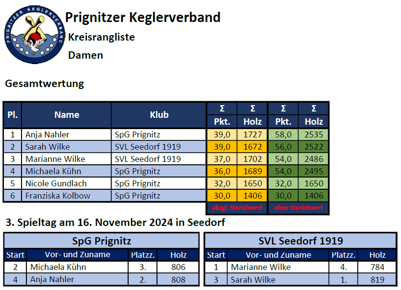 In der Gesamtwertung führt nun Anja Nahler (SpG Prignitz) punktgleich mit 39 Zählern vor Sarah Wilke (SVL Seedorf) die Tabelle an. Dahinter folgen Marianne Wilke (3. Platz/37 Punkte/Seedorf), Michaela Kühn (4./36), Nicole Gundlach (5./32) und Franziska Kolbow (6./30/alle SpG Prignitz).
