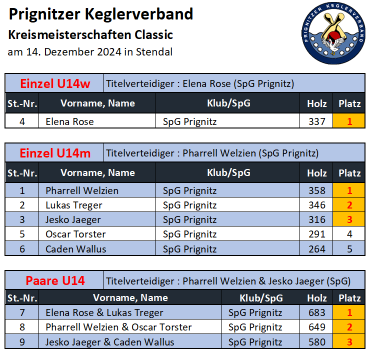 Bereits im ersten Durchgang zeigte Pharrell Welzien mit 358 Holz seine Titelambitionen. Jesko Jaeger blieb mit 316 Holz etwas hinter den Erwartungen, konnte aber Podestplatz 3 sichern. Im zweiten Durchgang schickte sich Lukas Treger an das Ergebnis des Titelverteidigers zu überbieten. Mit 346 Holz verpasste der junge Schönfelder die große Überraschung knapp und belegte einen tollen 2. Platz. Auf der Nebenbahn erzielte Doppelpartnerin Elena Rose 337 Holz. Im Schlussdurchgang betraten Oscar Torster (291 Holz/Platz 4) und Caden Wallus (264/5.) erstmals Classicbahnen.