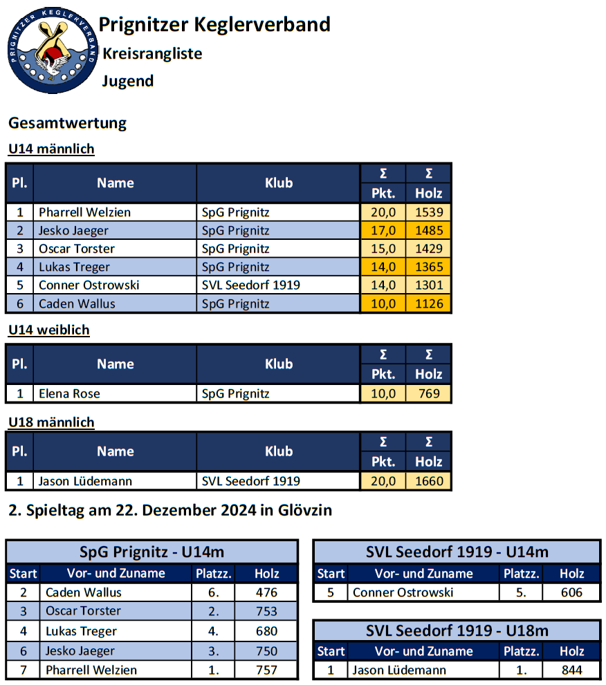 Neuer Kreismeister der U18-Jungen wurde Jason Lüdemann vom SVL Seedorf 1919. Er erzielte zum Abschluss 844 Holz. Elena Rose (SpG Prignitz) wurde durch den Start am 1. Spieltag Kreismeisterin der U14-Mädchen. Alle 3 Kreismeister sind für die Landeseinzelmeisterschaften (LEM) am 5. und 6. April 2025 in Pessin qualifiziert.
