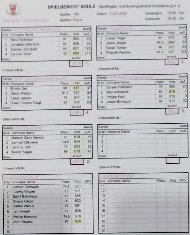 In der Einzelwertung schoben sich Jaeger (6. Platz) und Welzien (9.) unter die besten 10. Torster (15.) und Treger (17.) liegen im Kampf um die Startplätze zu den Landeeinzelmeisterschaften aussichtsreich im Rennen. Die Einzelstarter Caden Wallus (591 Holz/23. Platz) und Connor Ostrowski (576/26.) zahlten bei ihrem ersten LVM-Start Lehrgeld.