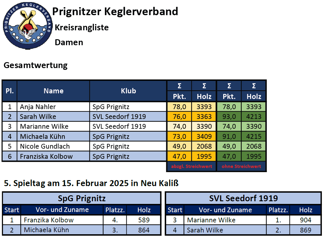 Auch am 5. und letzten Spieltag der Damen fehlte die Tabellenführerin Anja Nahler von der SpG Prignitz, die bereits als Gesamtsiegerin feststand. Während die zweitplatzierte Sarah Wilke vom SVL Seedorf mit 869 Holz und Platz 2 der Tageswertung ihren Tabellenplatz verteidigte, schob Vereinskameradin Marianne Wilke mit 904 Holz den absoluten Tagesbestwert und sich noch auf Podestplatz 3. Mit 864 Holz belegte Michaela Kühn von der SpG Prignitz Platz 3 der Tageswertung und fiel in der Gesamtwertung noch auf den undankbaren 4. Platz zurück, sorgte als Außenseiterin in dieser Saison trotzdem für einige Überraschungen.