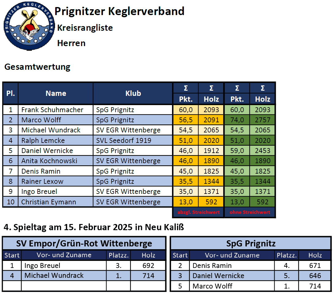 Da am 4. Spieltag der Herren der bisher ungeschlagene Tabellenführer Frank Schuhmacher von der SpG Prignitz nicht angetreten war, duellierten sich Marco Wolff (SpG Prignitz) und Michael Wundrack (SV Empor/Grün Rot Wittenberge) um erstmals in dieser Spielzeit einen anderen Sieger zu küren. Beide trennten sich abschließend mit jeweils 714 Holz unentschieden und teilten sich den Tagessieg. Platz 3 erspielte sich Ingo Breuel vom SV Empor/Grün Rot Wittenberge mit 692 Holz vor Denis Ramin (4. Platz/671 Holz) und Daniel Wernicke (5./646/beide SpG Prignitz).