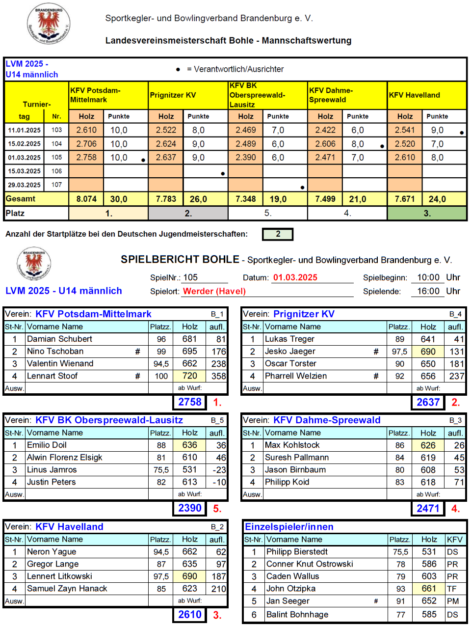 Wie bereits einen Spieltag zuvor in Luckau oblag es PKV-Schlussspieler Pharrell Welzien einen Rückstand auf das zweitplatzierte Team wettzumachen, was ihm souverän gelang. Mit seinen 656 Holz dürfte der Landesauswahlspieler aber trotzdem alles andere als zufrieden gewesen sein. Matchwinner für die Prignitzer wurde Jesko Jaeger im Duell mit dem Mannschaftsbesten Havelländer Lennart Litkowski. Beide trennten sich mit dem drittbesten Tagesergebnis von 690 Holz unentschieden. Die restlichen Hölzer für Platz 2 erkämpften Starter Lukas Treger (641 Holz) und Oskar Torster (650).
