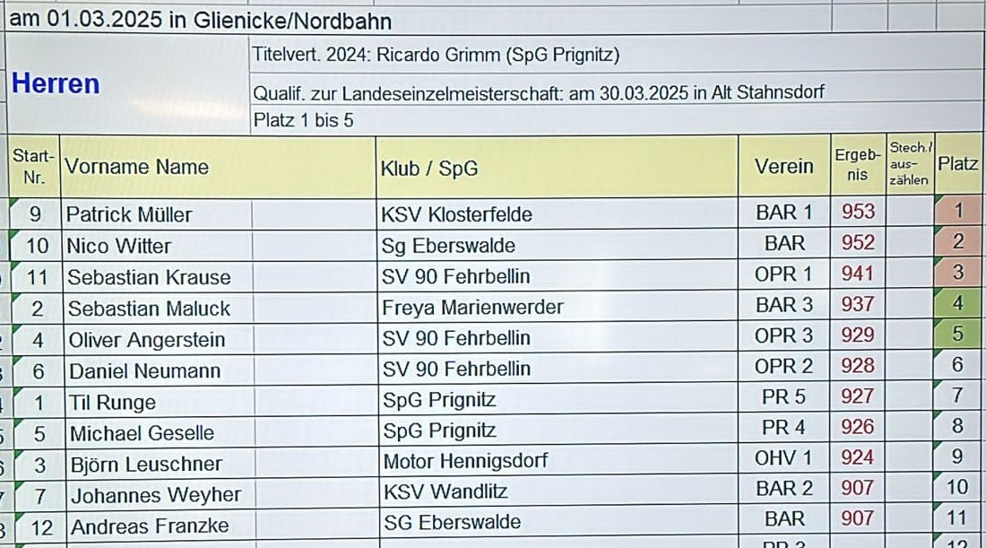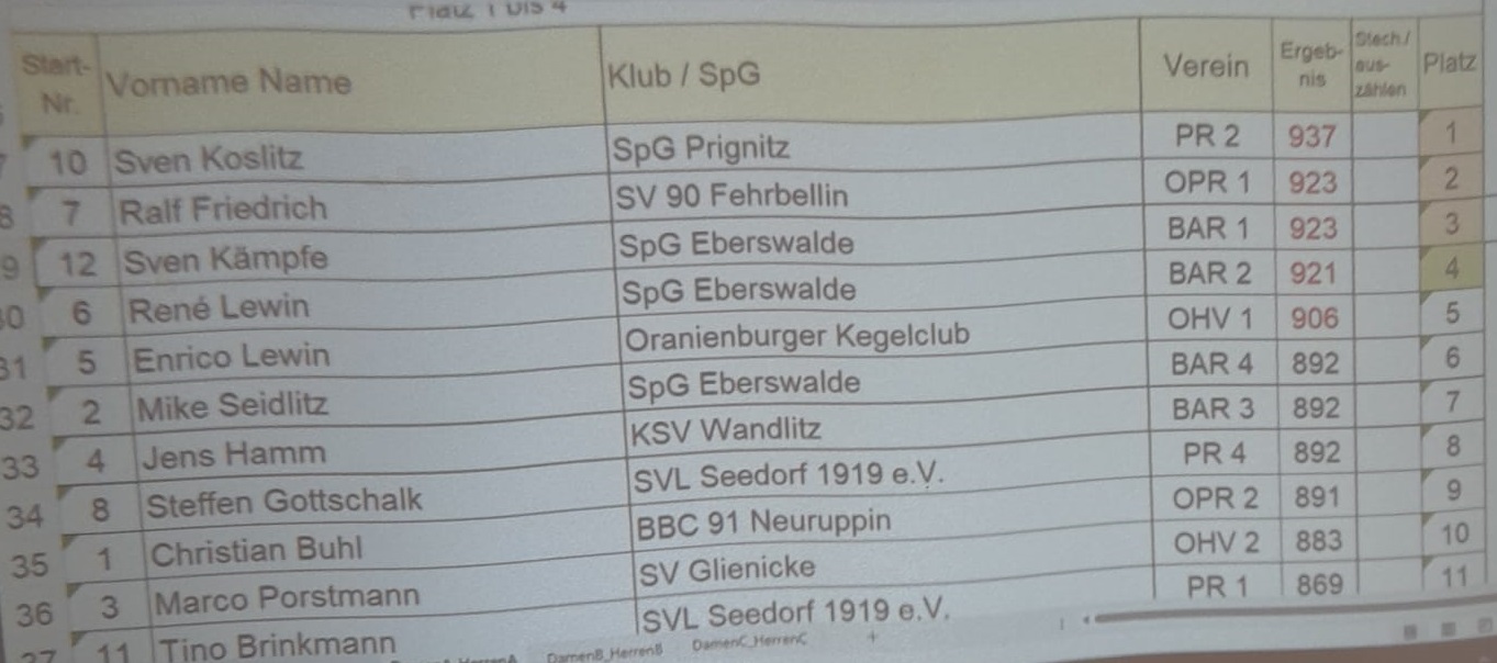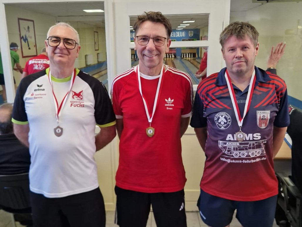 Sven Koslitz vom Zweitligisten SpG Prignitz errang mit 937 Holz souverän die Goldmedaille in der Altersklasse Herren A vor Ralf Friedrich vom SV 90 Fehrbellin und Sven Kämpfe von der SpG Eberswalde mit jeweils 923 Holz.