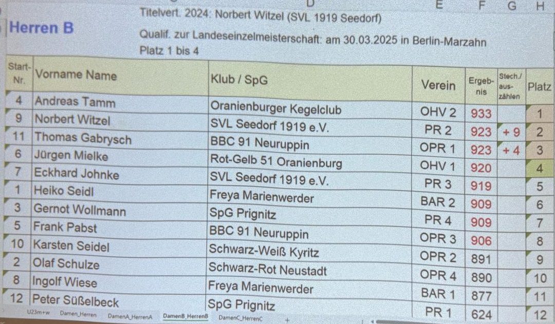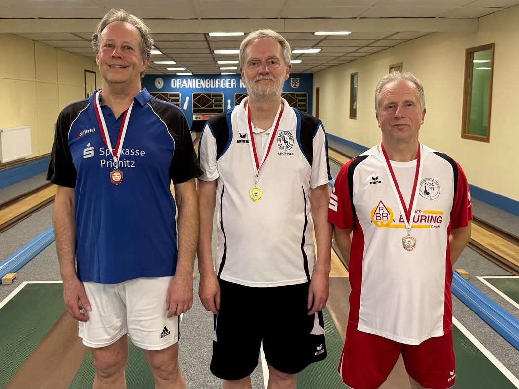 Im Anschluss errang Erstligakegler Norbert Witzel vom SVL Seedorf 1919 in der Altersklasse Herren B nach Sieg im Stechen gegen Thomas Gabrysch vom BBC '91 Neuruppin mit 923 Holz Silber. Lokalmatador Andreas Tamm vom Oranienbruger KC errang mit 933 Holz die Goldmedaille.