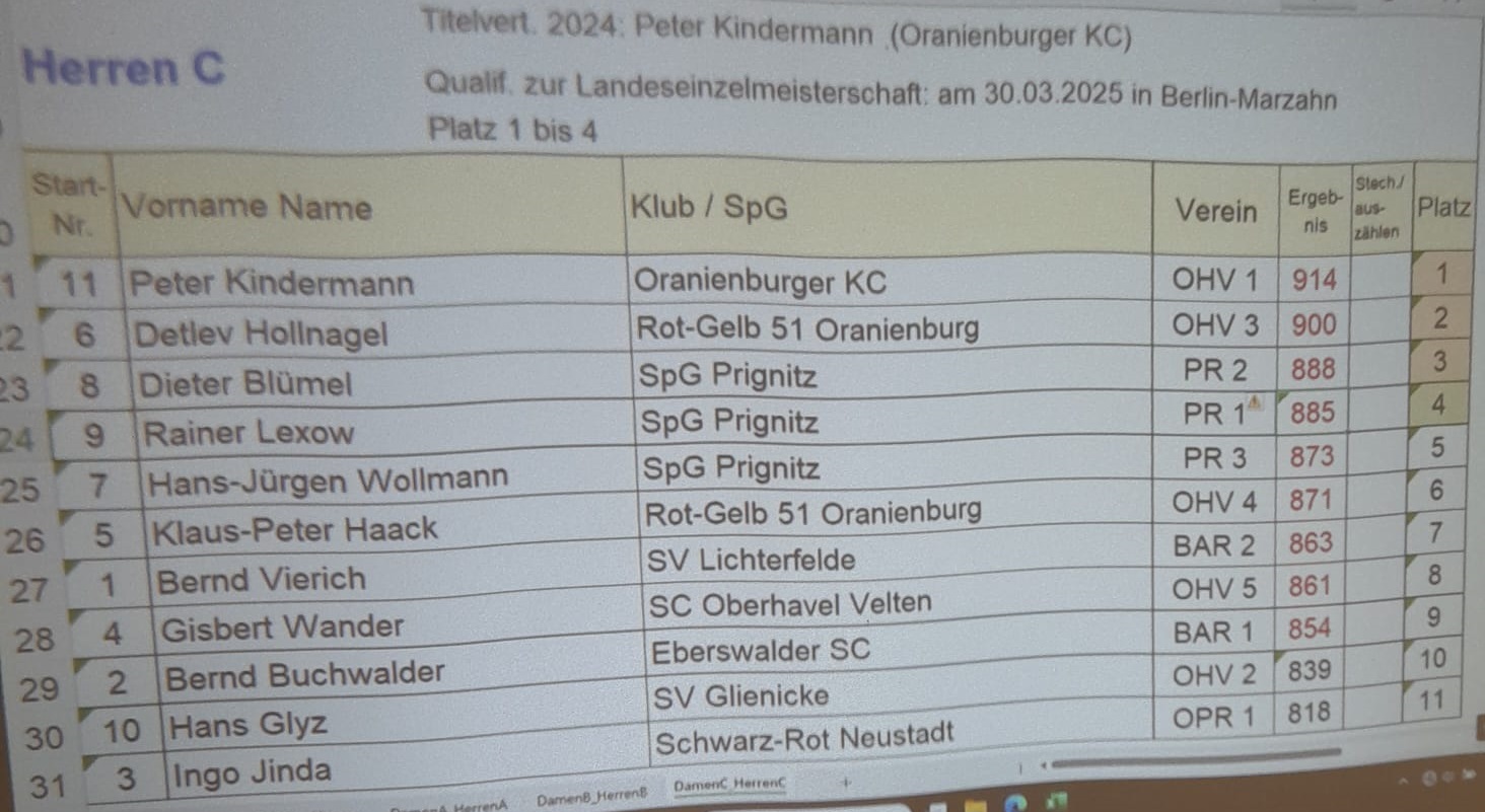 Die Bronzemedaille feierte Dieter Blümel von der SpG Prignitz mit 888 Holz hinter Peter Kindermann (914/Oranienburger KC) und Detlef Hollnagel (900/Rot-Gelb 51 Oranienburg) bei den Herren C. Zusätzlich qualifizierte sich SpG-Kegler Rainer Lexow mit 885 Holz als Vierter ebenfalls für die LEM.