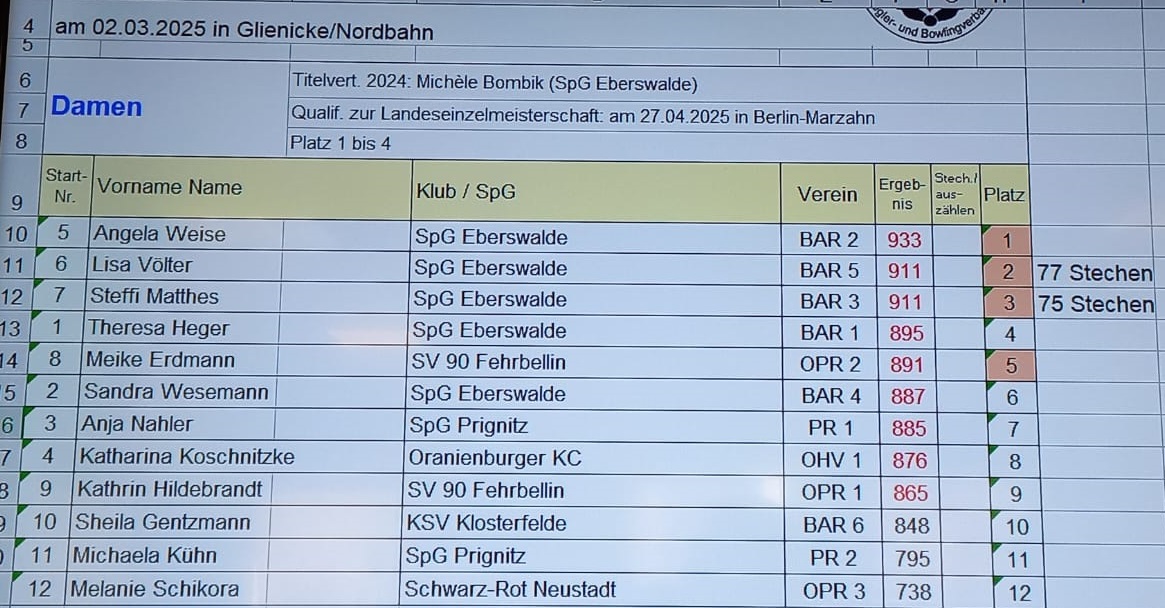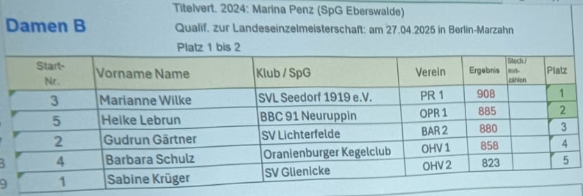 Mit 908 Holz errang Marianne Wilke vom SVL Seedorf 1919 in der Alterklasse Damen B die zweite Goldmedaille für die Prignitz. Ebenfalls über Medaillen freuten sich Heike Lebrun vom BBC '91 Neuruppin (2. Platz/885 Holz) und Gudrun Gärtner vom SV Lichterfelde (3./880).