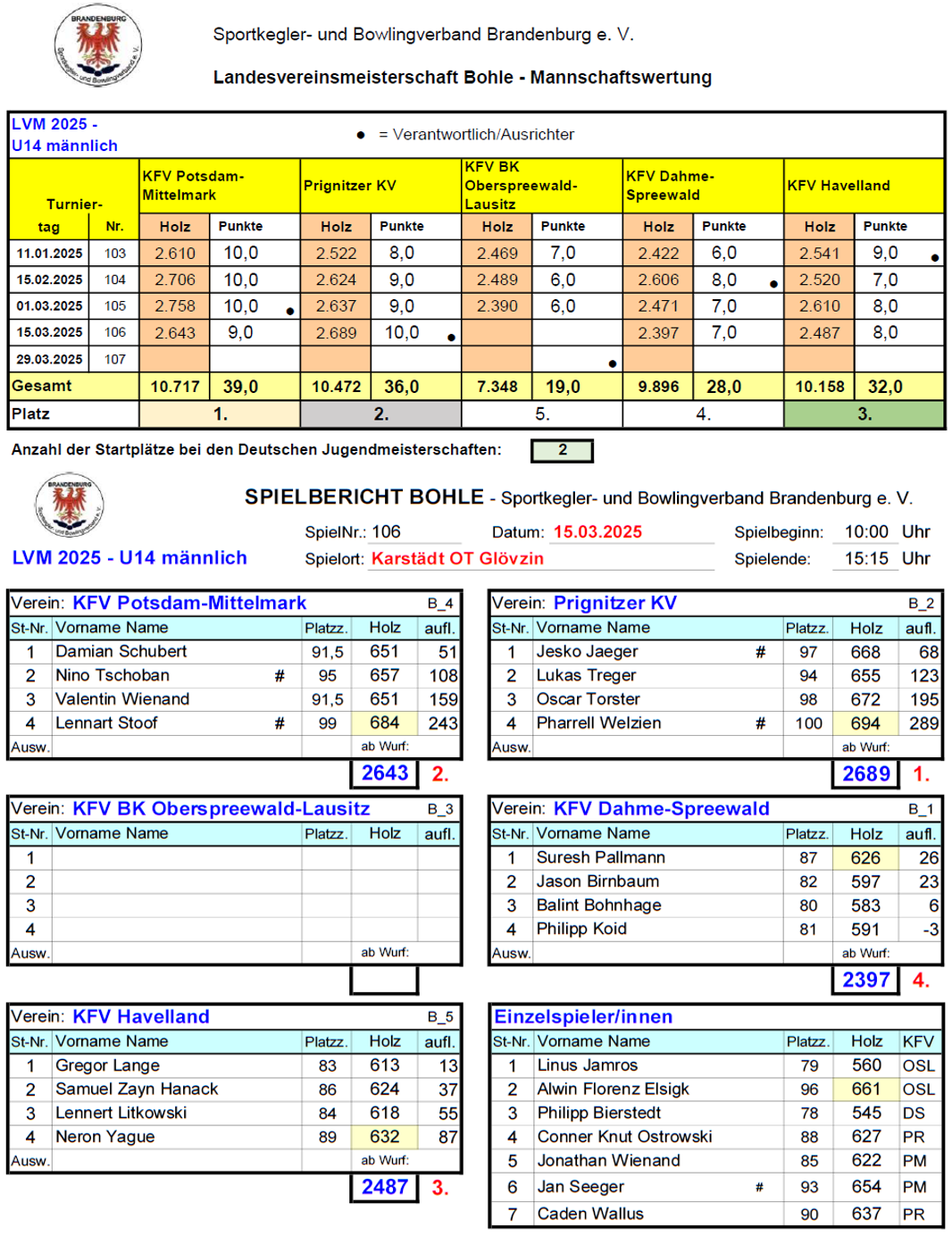 Mit nun 36 Punkten bauten die Prignitzer Jungs als Tabellenzweiter den Vorsprung auf das drittplatzierte Havelland (32 Punkte) in der Tabelle auf komfortable 4 Punkte aus und können nun fest mit der Qualifikation für die Deutschen Meisterschaften am 30. Mai in Kiel planen. Tabellenführer KFV Potsdam-Mittelmark bleibt mit 39 Punkten weiterhin das Maß der Dinge. Hinter den Podestplätzen belegen Dahme-Spreewald (28) und Oberspreewald-Lausitz (19) die Ränge 4 und 5.