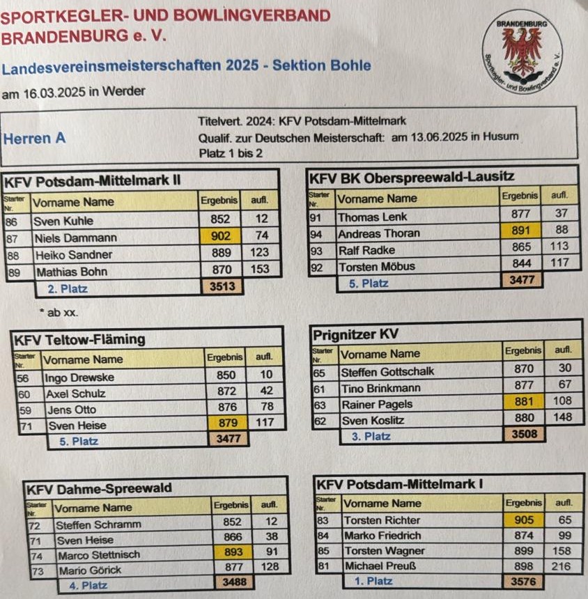 Den Prignitzern Steffen Gottschalk (870 Holz), Tino Brinkmann (877), Rainer Pagels (881) und Sven Koslitz (880) fehlten schlussendlich bloß 5 Holz zur Silbermedaille und der Qualifikation für die Deutschen Meisterschaften in Husum.