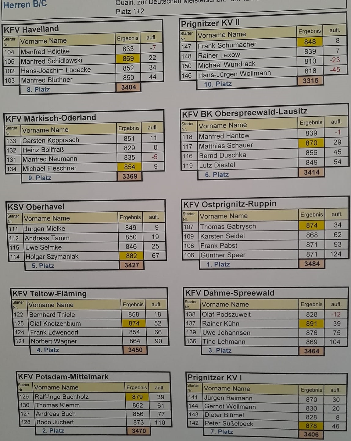 Beim Titelverteidiger PKV I überzeugten zwar Jürgen Reimann (870 Holz) und der Mannschaftsbeste Peter Süßelbeck (878), aber Gernot Wollmann (830) und Dieter Blümel (828) vermochten den kurzfristigen Ausfall von Norbert Witzel nicht zu kompensieren. Mit 3406 Holz und Platz 7 fehlen 58 Holz auf die Podestplätze. Neuer Landesmeister wurde Ostprignitz-Ruppin (1. Platz/ 3484 Holz) vor Potsdam-Mittelmark (2./3470) und Gastgeber Dahme-Spreewald (3./3464).