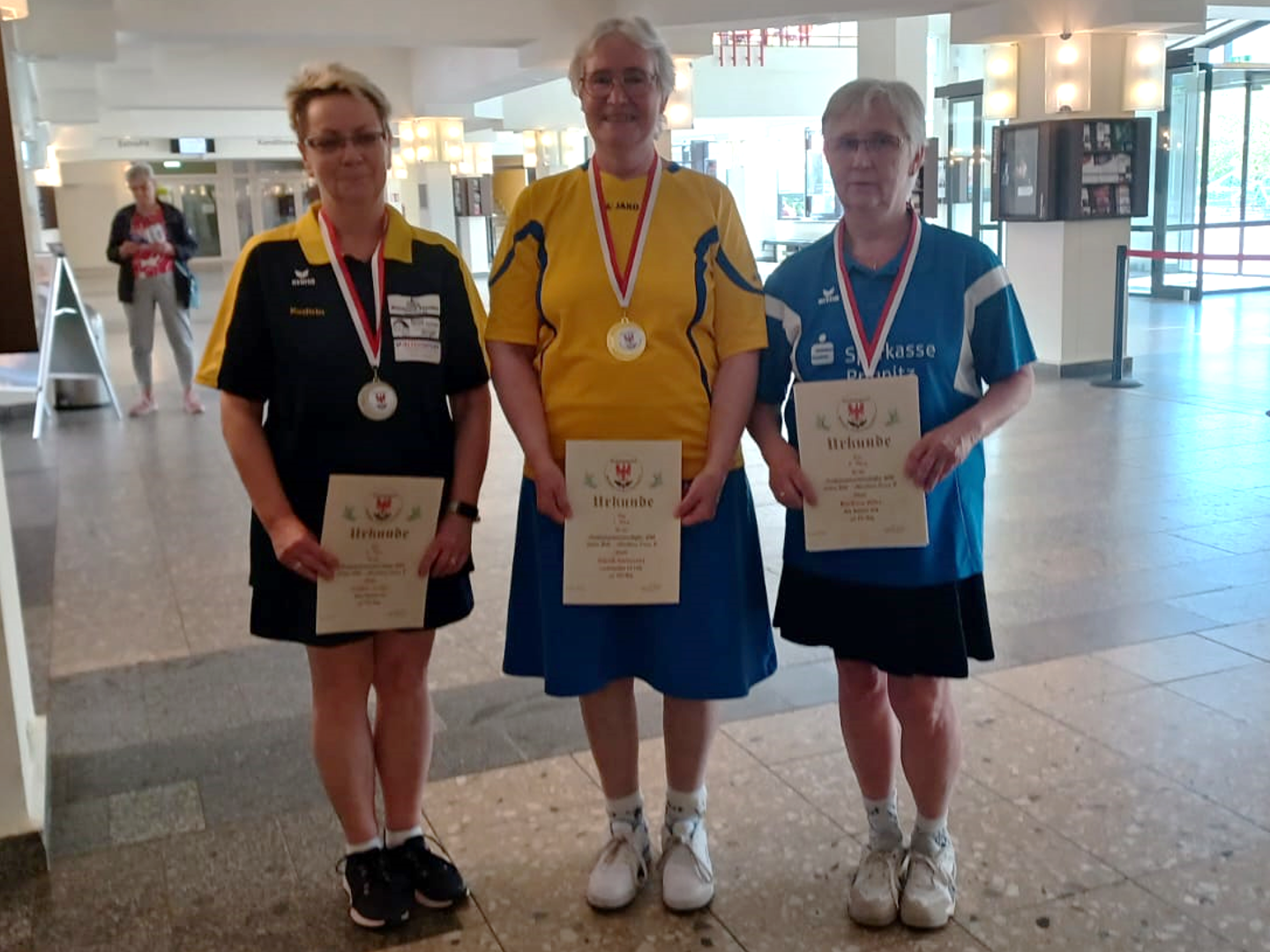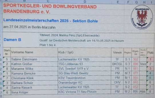 Den Sieg und die Goldmedaille errang Sabine Danzmann vom Luckenwalder KV überlegen und durchbrach mit 902 Holz als einzige Spielerin die 900-Holz-Marke. Vizemeisterin und Silbermedaillengewinnerin wurde Kathrin Grüßer von der TSG Lübbenau mit 896 Holz. Da 4 Startplätze zu vergeben waren und Grüßer auf ihren Startplatz verzichtet, qualifizierten sich neben Danzmann und Wilke noch Ramona Benecke (4. Platz/877 Holz/SG Blau-Weiß Beelitz) und Christiane Klink (5./865/KSV Treuenbrietzen) für die DM.