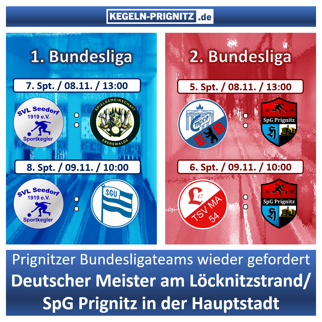 Die mitten im Abstiegskampf steckenden Kegler des SVL Seedorf empfangen am Samstag zum 7. Spieltag der 1. Bundesliga den Brandenburg-Konkurrenten SG Eberswalde um den ehemaligen Seedorfer Sven Kämpfe. Gegen einen direkten Konkurrenten um den Klassenerhalt ist ein Punktverlust verboten. Einen Tag später empfangen die SVLer den bisher verlustpunktfreien Titelverteidiger und Tabellenführer SG Union Oberschöneweide, der in den letzten beiden Spielzeiten 3:0-Siege am Löcknitzstrand einfuhr. Nichtsdestotrotz streben die zuletzt formverbesserten Seedorfer einen Sieg an, denn jeder Zähler gegen das Team um die Weltklassespieler Andre Krause und Andre Franke kann am Saisonende das Zünglein an der Waage spielen. Mit dem zur Verfügung stehenden Stammsechser könnten die Abstiegsplätze kurzfristig so auch wieder verlassen werden.