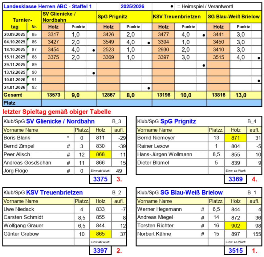 Nach dem Abschluss der Hinrunde hat Brielow mit 13 Punkten einen komfortablen Vorsprung auf die Verfolger Treuenbrietzen (10 Pkt.), Glienicke (9) und Prignitz (8).