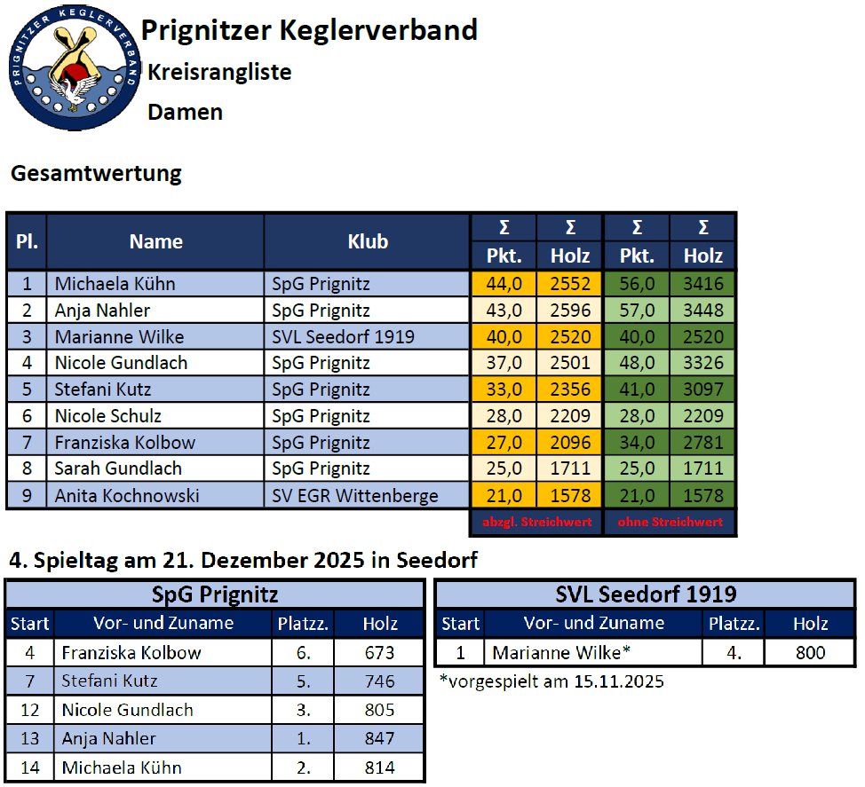 Bei den Damen dominierte die Tabellenzweite und Titelverteidigerin Anja Nahler von der SpG Prignitz mit dem Bestwert von 847 Holz den Wettkampf. Tabellenführerin Michaela Kühn, ebenfalls von der Karstädt/Perleberger Spielgemeinschaft, belegte mit 814 Holz den 2. Platz und hat mit 44 Punkten noch einen Punkt Vorsprung, liegt aber nach Holz bereits hinter Nahler zurück, sodass beide noch beste Chancen auf den Gesamtsieg haben. Die mit 40 Punkten auf Tabellenplatz 3 liegende Marianne Wilke vom SVL Seedorf belegte mit 800 Holz Rang 4 und steht davor es erneut auf das Podest zu schaffen.