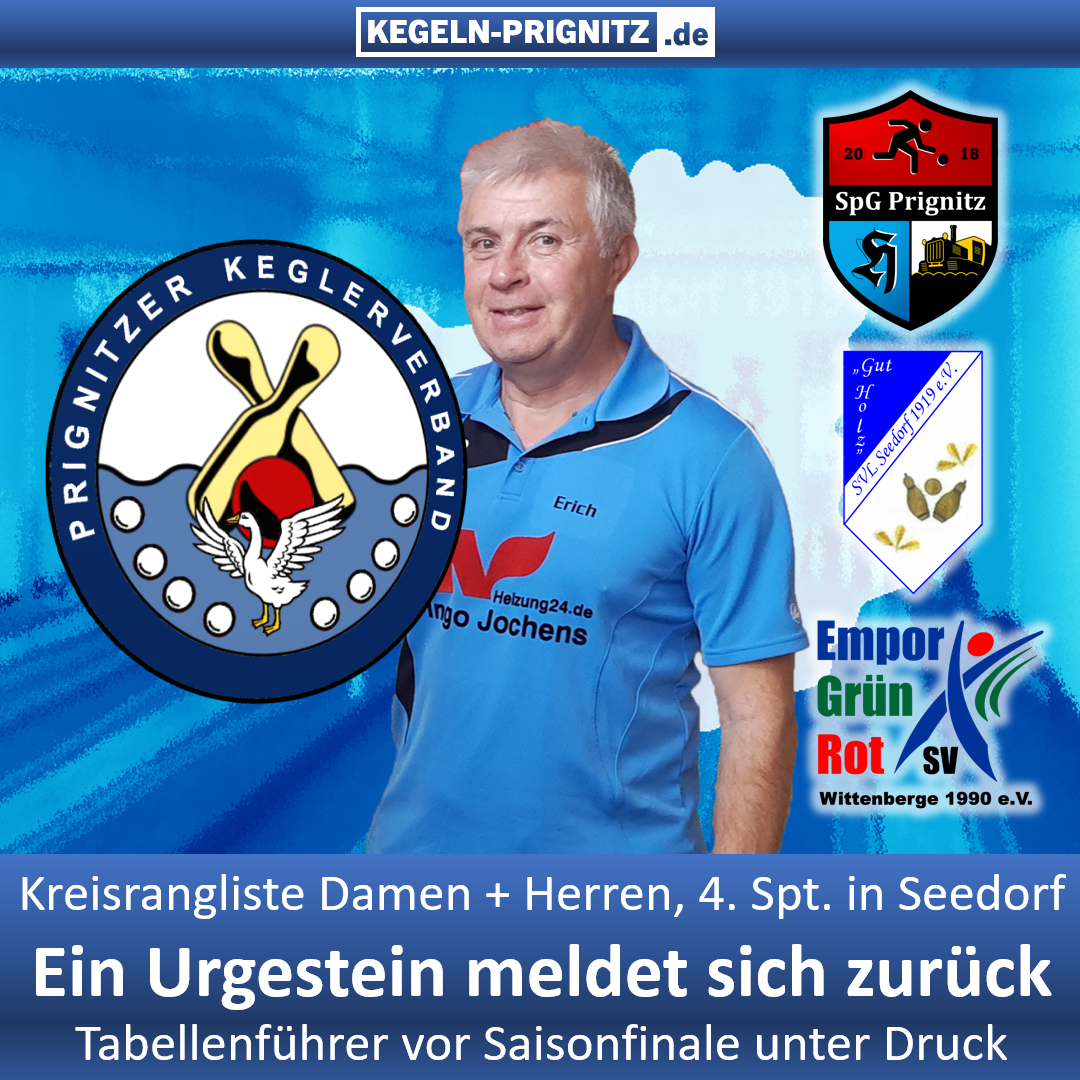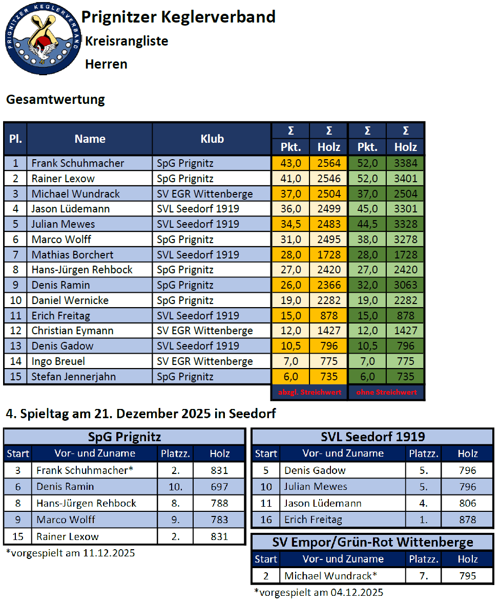 Tabellenführer und Titelverteidiger Frank Schuhmacher von der SpG Prignitz teilte sich mit seinem Mannschaftskameraden und nun ärgsten Verfolger Rainer Lexow mit jeweils 831 Holz den 2. Platz. Vor dem letzten Spieltag trennen beide mit insgesamt 43:41 Punkten weiterhin nur 2 Zähler. Dem mit 795 Holz nicht über Rang 7 hinauskommenden Tabellendritten Michael Wundrack (Ges. 37 Punkte) vom SV Empor/Grün-Rot Wittenberge sitzt nun Jason Lüdemann (Ges. 36 Punkte) vom SVL Seedorf, der mit 806 Holz Platz 4 belegte, im Nacken.