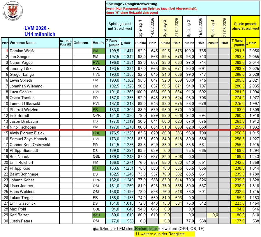Zielsetzung für den finalen Spieltag am 21. März in Luckau ist es sich mit dem derzeit elftplatzierten Pharrell Welzien und Oscar Torster doch noch gemeinsam unter die 10 besten Einzelspieler zu schieben sowie auch mit Conner Ostrowski das Ticket für die Landeseinzelmeisterschaften zu lösen.